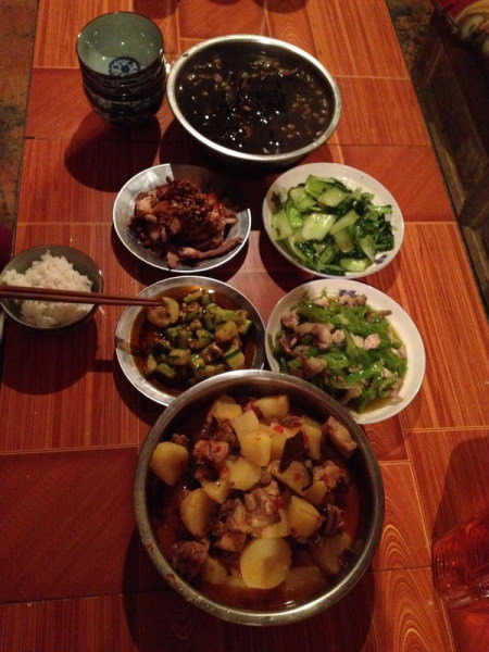 18:00云还是未曾散去,日照金山基本无望,我们收拾东西下山回到客栈,晚餐是极简单的土豆丝、炒莲白、蒜薹肉丝和小白菜汤。