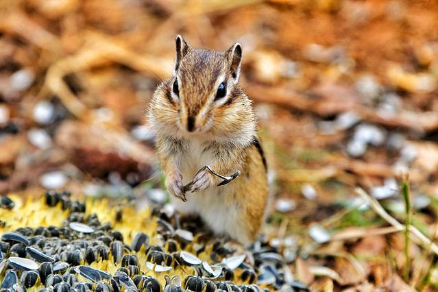 这只小松鼠真是萌的不要不要的啊!除了不让其它松鼠来和它争食,其它一律不管,看它动作娴熟的,这个小吃货一会儿就消灭了一大半葵瓜子。