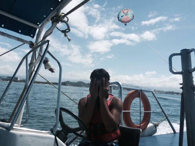 坐在上面看着海面~远处的风景~蓝蓝的天空~觉得好开心(ps虽然近视~只看到色彩~哈哈~但是也很爽~自由飞翔的感觉)150马币两个人。