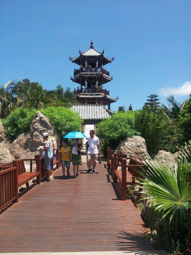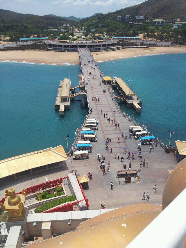 到了三亚 绝对要来趟南海观音 才不枉此行 南海观音是一座三面佛像 屹立在海中心 三面环海一面有桥 那景观远观十分壮观 乘坐巴士到达庙口 一路蹭着别的导游 一边看一边听 是庙里有很多礼节 记得最清楚的是可以供一盏莲花灯求平安 求事业 一盏是十元香油费 进大殿需要脱鞋 中殿祭拜完就可以上二楼一观三面观音的近颜了 (走完这个寺庙就快过一天了 寺庙外是有很多景点可以去逛的)午餐我们是在斋菜馆吃的 好像也不贵