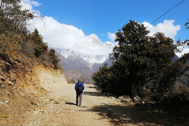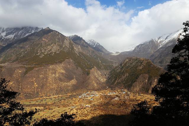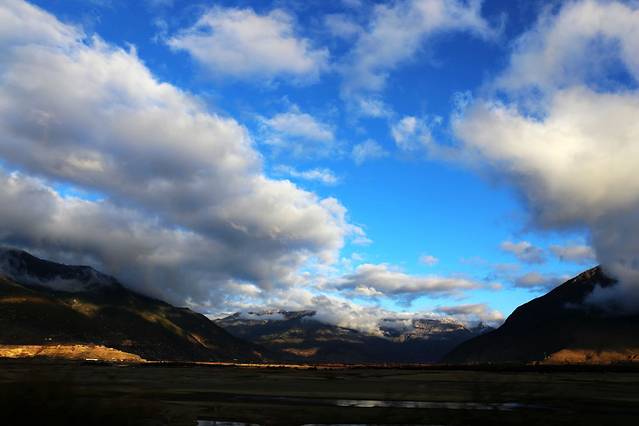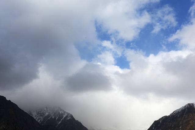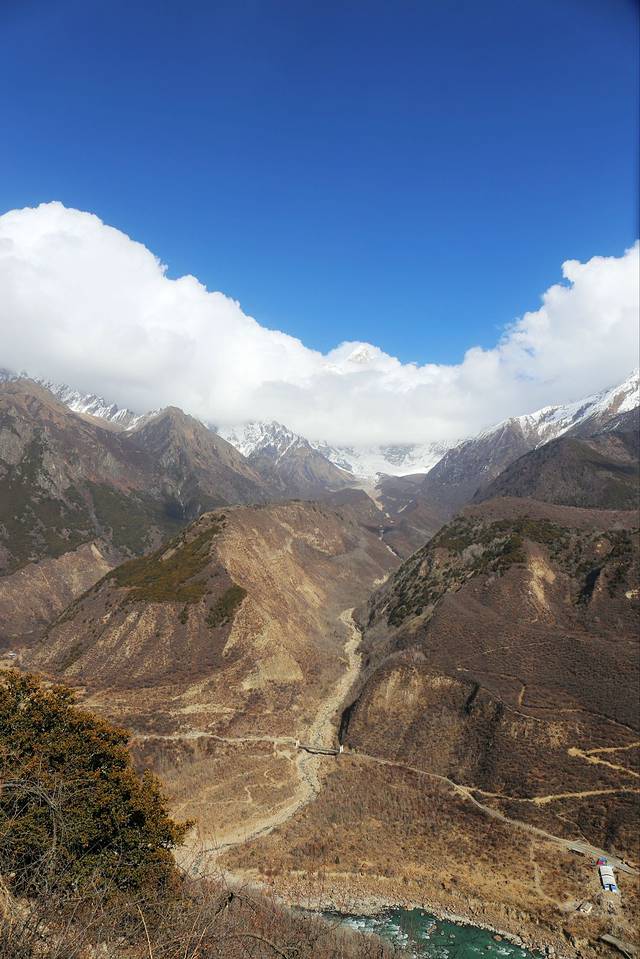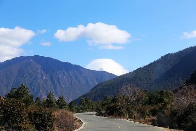 进入峡谷!远处南迦巴瓦山尖上的旗云!