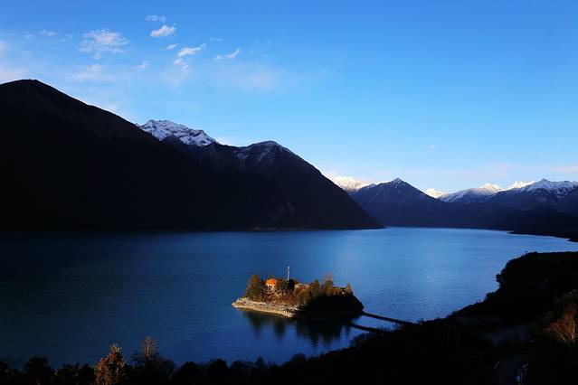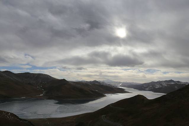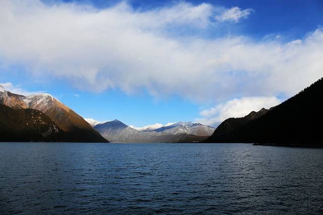 巴松错。来的时候稍微有些晚了,太阳被云层和山峦遮挡!
