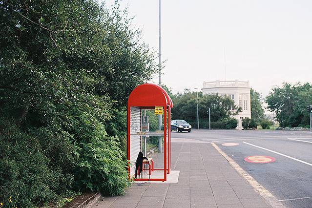 而这个则是一个长得非常像电话亭的公交站台,玻璃门上还带着一滩非常失败的涂鸦。