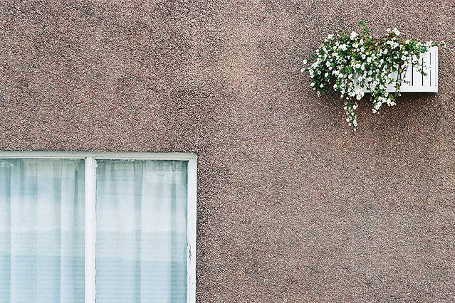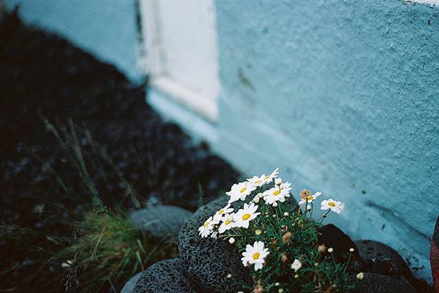 夏天连墙角都不放过,旅馆房间外的墙角下,一簇小白花儿正在黑乎乎的熔岩石中骄傲盛放。