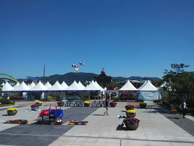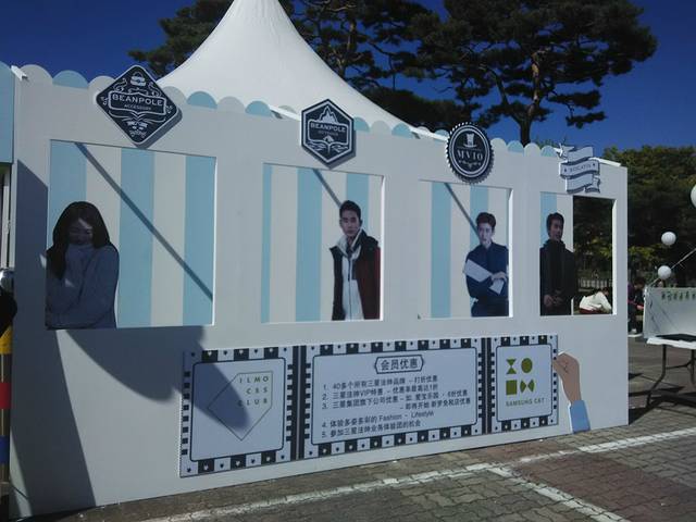 庆典是在清州艺术殿堂,综合竞技场举行的。还没进去就看见一个大屏幕正在放《继承者们》,有好多小帐篷搭起来的小摊子在做活动。