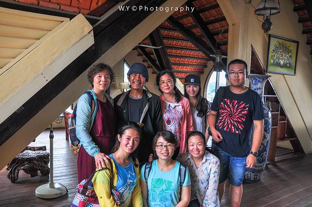 我们碰到了沙非的大boss(图中戴帽子的男人) 我们很兴奋的在拍各种古董汽车啥的,这个人也是,我妈还嫌他咋老遮住了视线。。。不记得我和boss是咋开始对话的了,只记得他说他是老板,然后我心里一嘀咕:老板不应该是个法国人么? 我半开玩笑的继续问:“那多少钱买的啊?” “400万美元,全部都在里面了” 我瞬间石化,Oh,My god,真的是老板啊!真是人不可貌相,老板是越南华裔,在胡志明做灯具生意,很少来这里,四年前从法国人手中买下了这里。真是不可思议,我赶紧召集了众人,来拍了张合照。