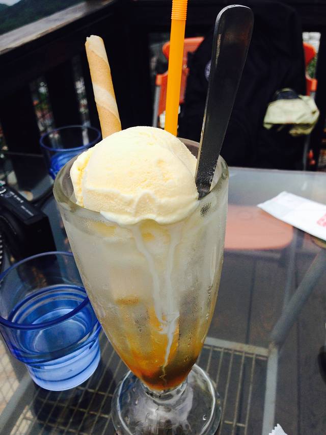 来九份,一定要去阿妹茶楼品茶。据说阿妹茶楼就是千与千寻汤屋的原型。坐在阿妹茶楼的外面,看山,看水,看海,与朋友畅谈人生,啊~妙哉~。可惜那天天气不好,拍不出好看的照片,不过我的拍照技术也要加强哇。这边茶楼的消费水平比大陆应该是便宜的,最低消费150新台币,我要了这个冰淇淋150新台币。其他小伙伴品茶,一人300新台币,赠送小点心。品茶最后会赠送一张明信片,也跟着蹭了一张哇。