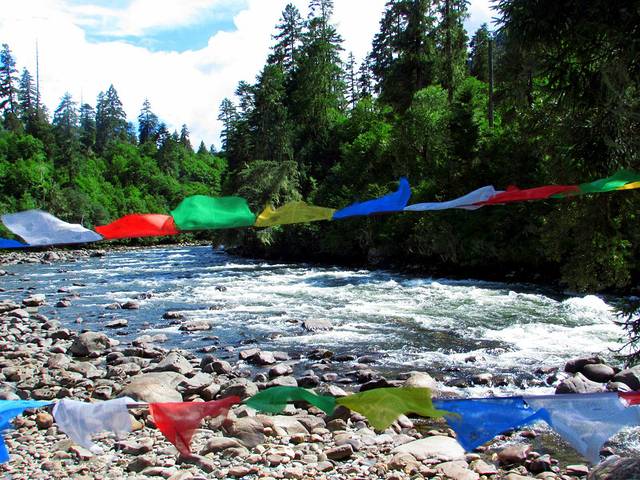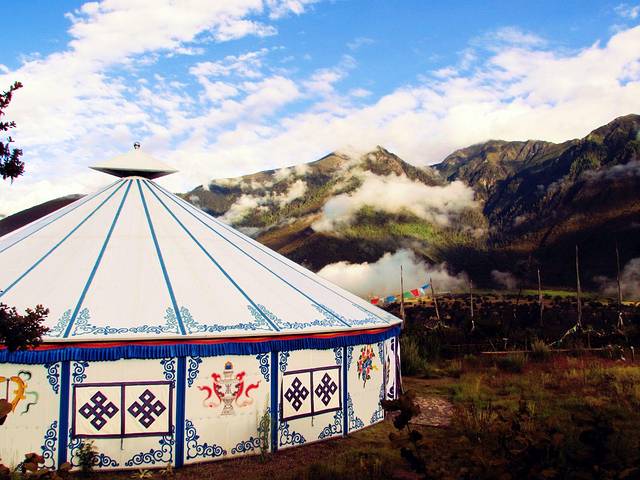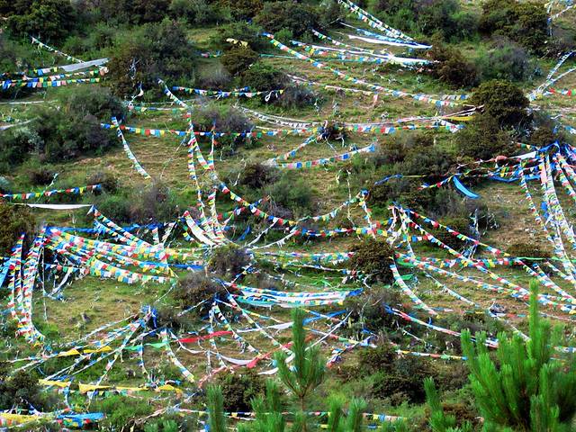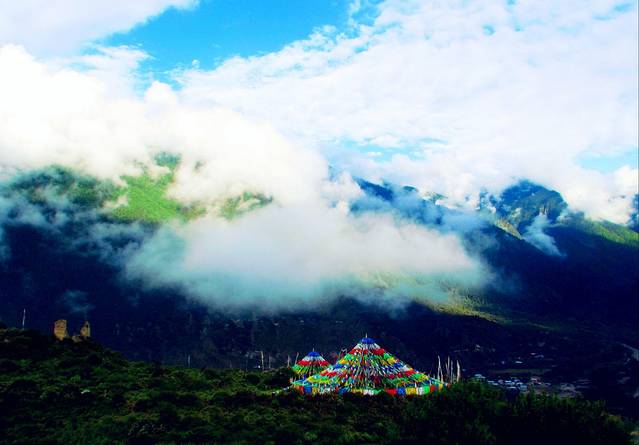 山谷里,云雾缭绕,艳丽的经幡随风飘扬〜