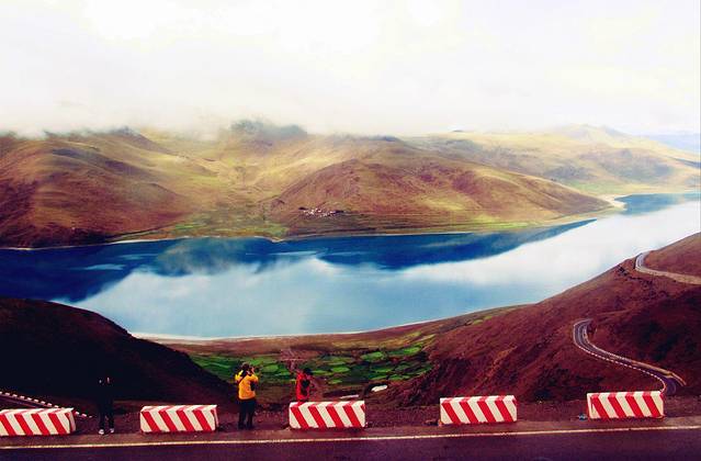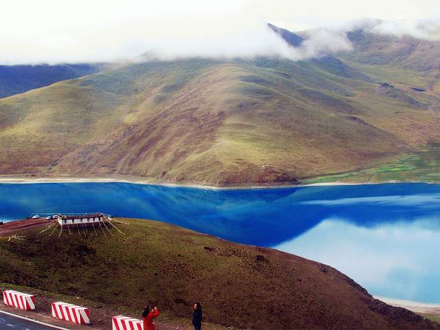 我们的车停在山坡上俯瞰羊湖,游客很多很挤