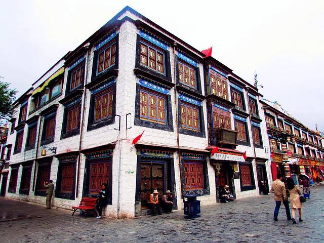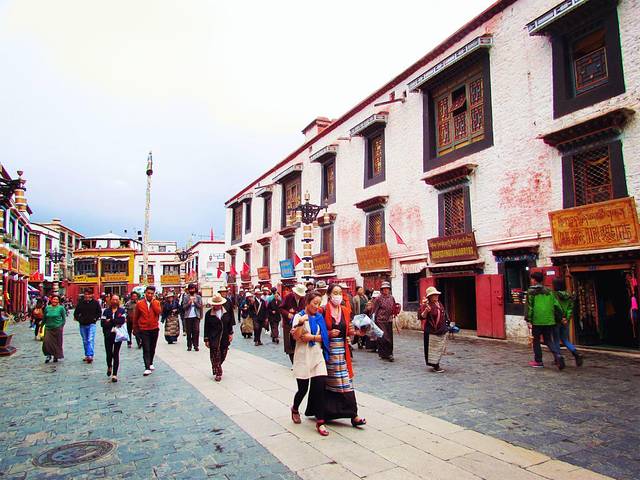 八廓街也叫八角街,它是围绕着大昭寺修建的一条最具藏式生活气息的街道,也是藏传佛教最重要的转经道路。过去这里曾是贵族商贾聚集的场所,很多百年老建筑至今保存完好,是拉萨民居艺术的鲜活范本,逛这条街按照顺时针方向,也就是与藏民转经磕头的方向一致的。