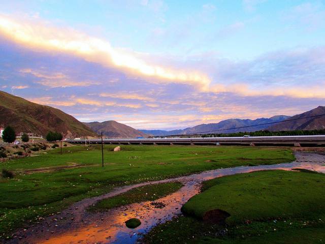 一大早去林芝,在墨竹工卡停车休息,看到这里的朝霞~一道绚丽的光跃过天际,心旷神怡〜