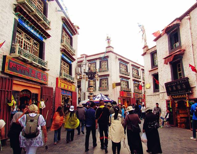 八廓街上的工艺品饰品很多,但大多是仿制品,下午六点以后这里就变成一般集贸市场,以日用品为主。附近有个冲赛康市场,位置在北京东路与八廓北街之间,是拉萨最大的小商品批发市场,相当于武汉的汉正街,这里有浓浓的酥油味,堆积如山的牦牛肉,尼泊尔的红茶....那些头扎红色英雄结的康巴人,仍保持着这里传统的地盘优势,他们还会用袖谈的方式做生意。