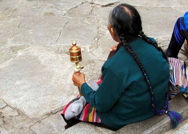 大昭寺广场上坐着转经筒的妇人们,神情安详