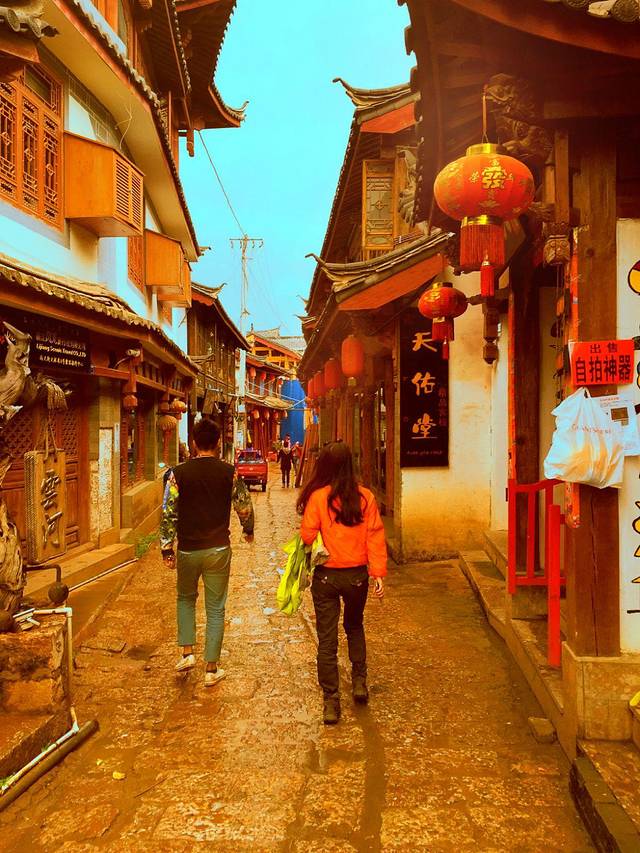 晚上迎着大雨逛了一番古城,因为下着雨,街上人烟稀少,甚是冷清,虽然很多商铺还开着门,但鲜少有人出入。古城的房子都是老式结构的瓦房,高耸的房顶,清一色白墙,密密麻麻的集中在这里。因为附近几条街各种相似的建筑,让我们找不到回客栈的路,在一条长廊绕来绕去走了40分钟。这里的客栈式宾馆让我抓狂,没有空调,外温7度,室内12度,热水要等半小时才能出来。