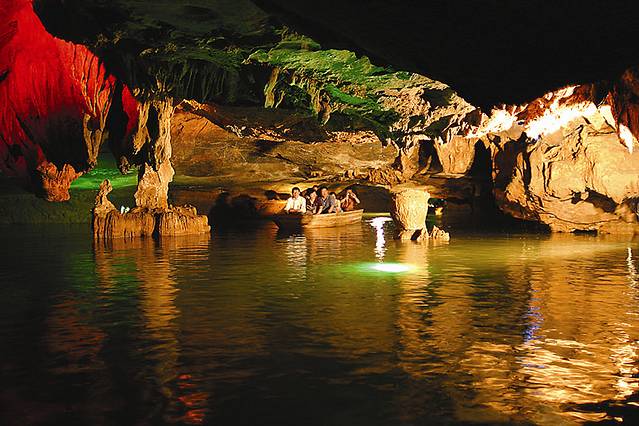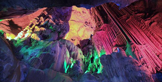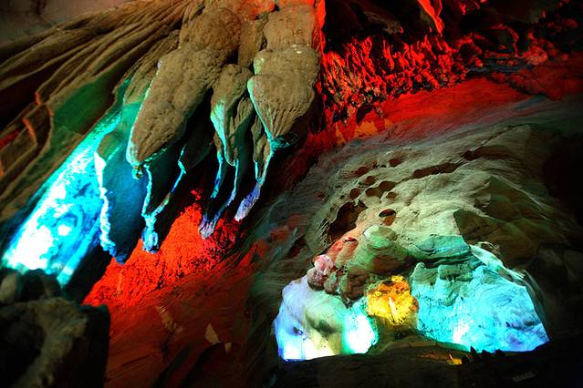 溶洞的奇形怪状岩石在灯光照射下更加绚丽了...