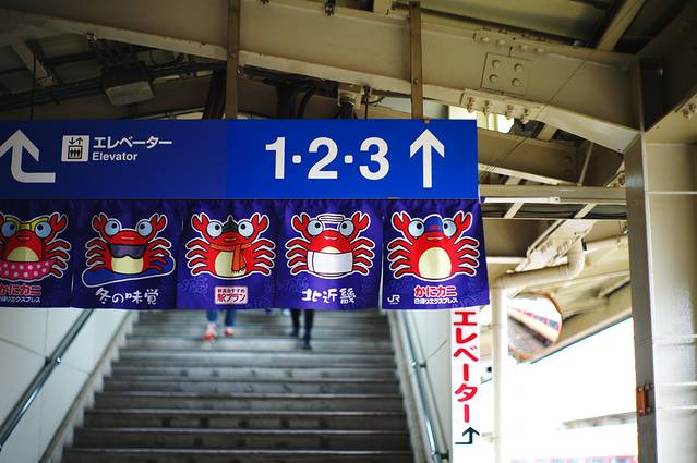 刚走出JR车厢,还没出车站,看到站台上挂着非常可爱的卡通螃蟹横幅,冬的味觉--松叶蟹