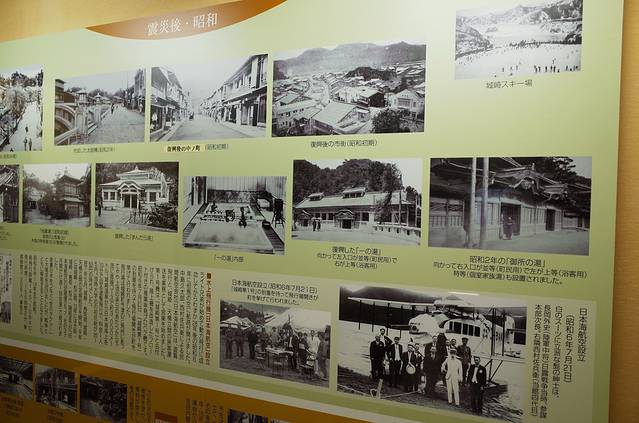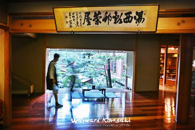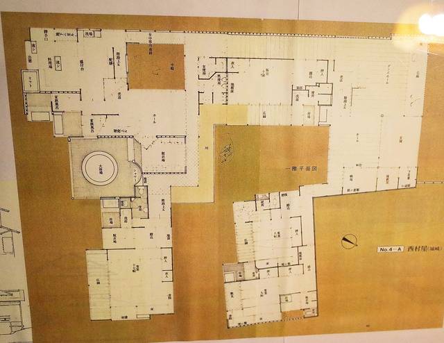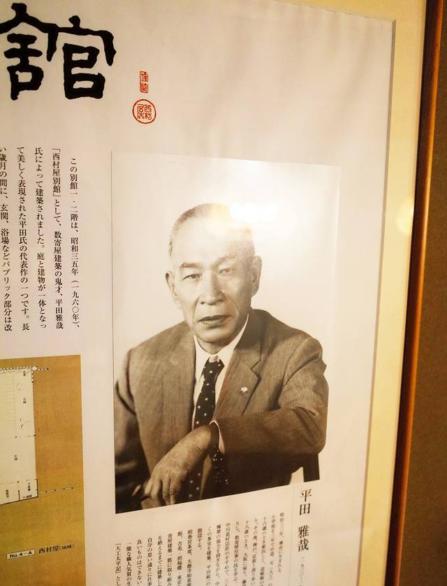 城崎镇上最好的酒店是一家叫西村屋的传统旅馆,是一家有着一百多年悠久历史的老店,它们家非常有眼光,早几十年前就请了一位日本的老建筑师平田雅哉设计了旅馆的建筑。本来想去入住下,查询了下价格,发现两人含早晚餐得3千多人民币一晚(如果一个人入住就只需1400左右),实在是任性不起来,幸好在去日本之前,通过在日本做建筑设计的朋友,辗转帮忙联系上了西村屋的总经理,表达了一位热爱旅行的中国屌丝建筑师,想参观一下他们家的建筑的愿望,得到了他们的许可。到达西村屋之后,虽然我们不住在这,但是令我惊讶和欣喜的是,西村屋非常热情的接待了我们,派了专员陪同引领我们参观,受崇若惊,途中有那么几个片刻,我非常想问他们,你们是不是认错人了?陪同我们参观的是一位西村家的后人,在店里任经理。据他介绍,他妈妈是西村家的女儿,这么说起来,应该是外婆家了,一进门,需要脱鞋后进入酒店内部,他说西村家祖上是城崎镇的镇长,城崎的温泉历史悠久,但是百余年前,遭遇了将城崎夷为平地的大地震,是这位镇长带领大家重建了城崎,他的西村老祖也在镇上受到了敬重,多处都有塑像,他带着我们先参观了西村屋的陈列展览馆,里面除了历史图片资料还放了许多的实物