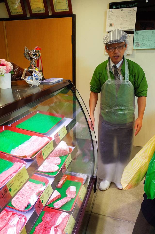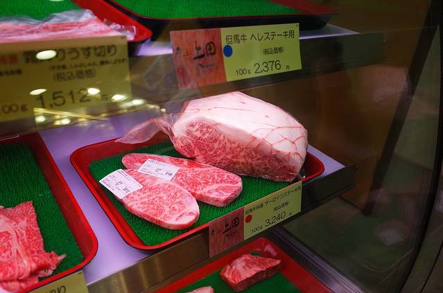 继续往前走,路过一家牛肉店,这家店是卖新鲜牛肉的,牛肉的品种也是日本非常有名的一种名牛,就是在城崎开篇提到的但马牛-神户牛的妈妈,我们不买牛肉,也不是牛肉的搬运工,我们纯属进去参观溜达的。