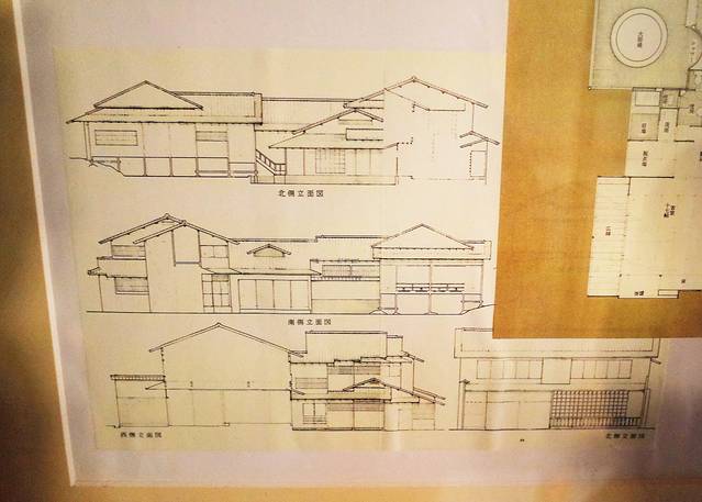 他画的平立剖面图纸,据说他的设计手法深得当时来日本设计帝国饭店的美国建筑大师赖特的影响,后来在参观西村屋的过程中也确实有这个感受