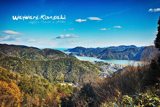 天气晴朗的城崎,在最高的山顶俯瞰小镇,远眺大海,左侧那片蓝蓝的海域是日本海,天空中零星飘着几朵白云