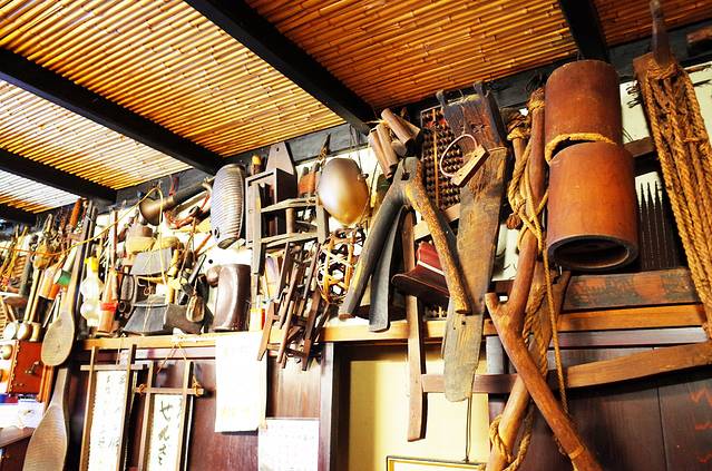 墙面上挂满了各种装饰品,其中一面墙上挂满了各种城崎传统劳作工具