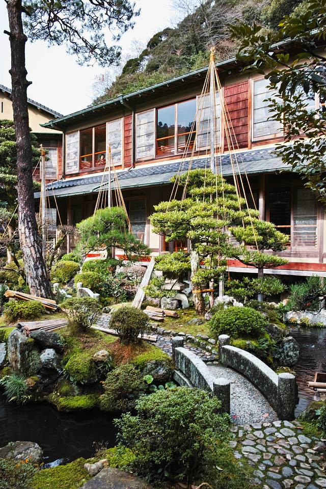 在路径上行走着,会看到靠山的一侧,山体处理成景观,与旅馆内部相互呼应,而旅馆内部的行进路径和空间也设计的非常有意思,台阶、吊桥,与旁边的侧院形成非常丰富的复合空间。被前厅和休息厅环绕着的内庭院,推门走进庭院后,发现酒店正在为抵抗即将到来的大雪加固保护院子里的树木,但是依旧可以看出这个歌打理的非常精细得花园,庭院里的摆设都是非常考究和有年份的古件