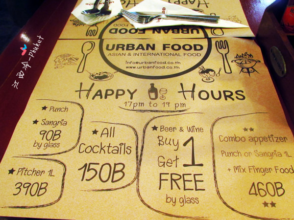 来到urban food吃饭,这是欢乐时光的宣传单子,下午17:00-19:00,啤酒买一送一,所有鸡尾酒150B。看到欢乐时光就想到港剧的台词