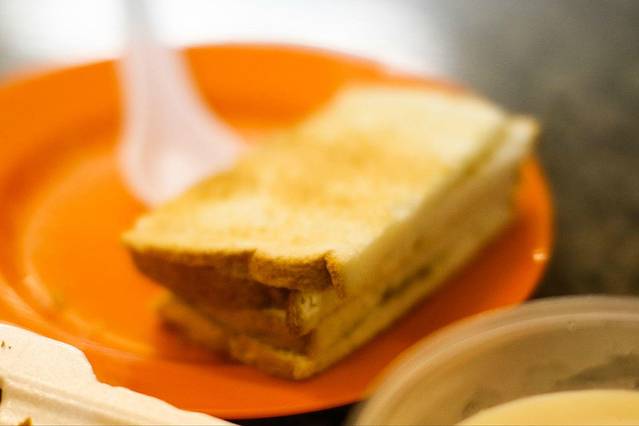 这是当地一家茶室的小吃,里面有凤梨,黄瓜,还有叫白瓜的水果浇上虾酱,我吃起来时觉得味道怪怪的,不过右边的豆花(我觉得更像是豆奶布丁)味道超赞,不过我要推荐的是这面包!是茶室自己做的新鲜面包,烤酥后,夹一片冰凉的黄油,咬下去,热凉混合,真的,这是我吃过最美味的面包,没有之一~~~