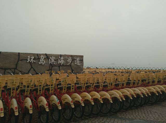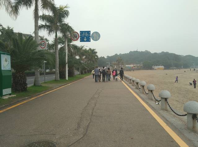 5块钱一盒的芒果几乎是每天的必备水果, 即使有些黑心商贩掺了不新鲜的, 还是能尝到它的香甜. 一大早在步行街又尝了几种小吃: 烧肉粽, 大肠包小肠(看起来实在没什么食欲), 月亮虾饼,名字都是响亮亮, 想必大家尝的也不过是个名声, 旅行中总是少不了看风景, 吃美食, 权当一种经历.这天还是下着小雨, 乘坐万能的112路公交车到胡里山炮台, 它与环岛路贯穿, 看到一大片自行车海, 又看到了海, 冬季来这个城市最大的遗憾就是只能眼巴巴地看海, 什么也做不了, 可游人还是摆出各种造型与大海合影, 大家对于旅行这件事的兴奋实在是溢于言表.