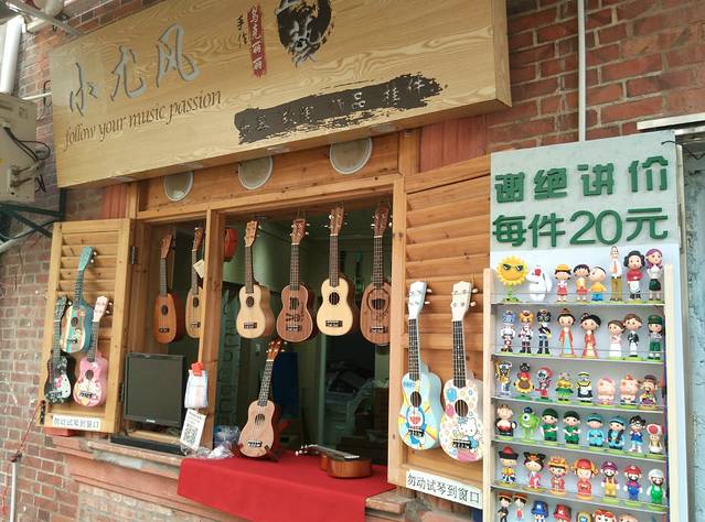 吃饱喝足开始游岛, 没什么目的,也没想找到什么特别的地方, 就是随心逛着, 那天天气真是不错,看看古树, 瞅瞅民宅, 顺便再吃点小吃. 炸鲜奶一串10元(4小块), 脆皮泡芙15元一个, 景点的价格抱怨也没用. 发现岛上卖尤克里里的小店特别多, 是当地人还是游客对这种乐器有偏爱吗?