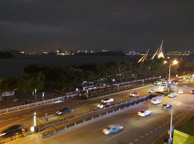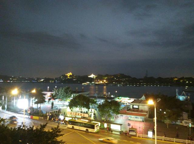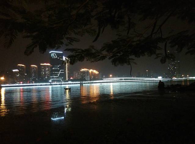 终于有了住的地方, 也到了饭点儿, 出了宾馆不到30米就是美食街, 这是当天最兴奋的时刻. 晚上的美食街聚满了人,各种小吃, 海鲜大排档, 有些是明码标价的, 像烤生蚝一般都是10元10个, 龙虾50元一只, 挺大的, 可惜呆了5天, 就没尝一尝, 其他海鲜价格可以问店家, 也可以讲价, 比较啊,大家一定要多比几家. 我们在街里从头走到尾, 最后选了街尾的一家大排档坐下,点了当地有名的海蛎煎, 蒸仙贝, 还有个干锅包菜, 太饿了, 不能光吃小吃哦. 价格适中, 味道也不错, 看到临桌可能是当地人, 他们点了白灼虾等, 闻着都鲜. 出了美食街向东就是步行街, 喜欢夜景的朋友不妨再逛逛, 各色店铺有海鲜排档, 服装店, 礼品店等; 凤梨酥等馅饼是出了名的, 很多饼店新鲜烤制, 但价格也是小贵. 在厦门的第一晚着实被夜景吸引了,之前从宾馆的大露台上看到了对面的海, 也看到了海对面的鼓浪屿, 很是好奇. 晚饭后步行到海边, 游船欢快地唱着, 鼓浪屿上郑成功雕像亮得耀眼.