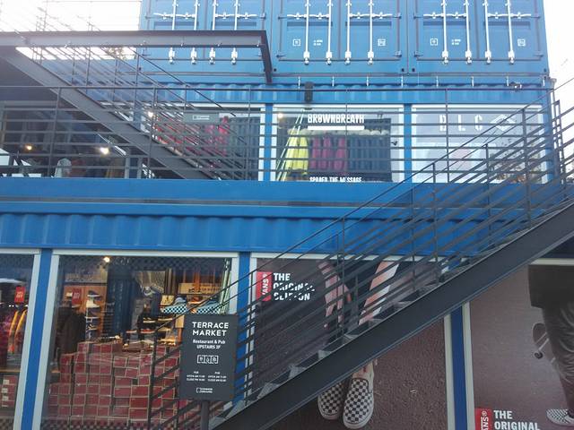 沿着箱行走,箱子的头是格子状,插空有透明的橱窗可以一览箱子里面的东西。走着走着就看到了集装箱的大入口。纵观,箱子建筑一共分三层叠建,左手边是左半边凹形集装箱入口,右手边露天楼梯,可以通往另一边平角集装箱每一层。