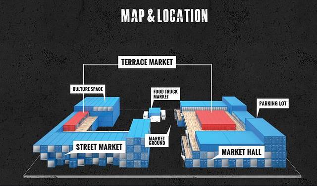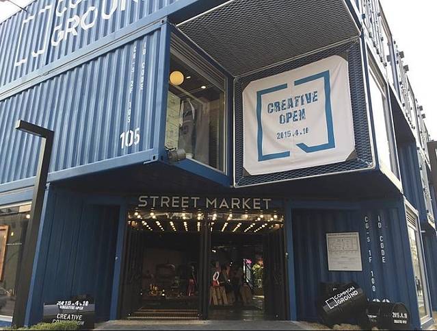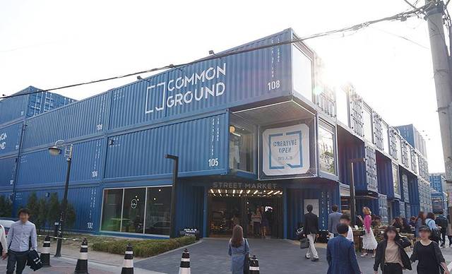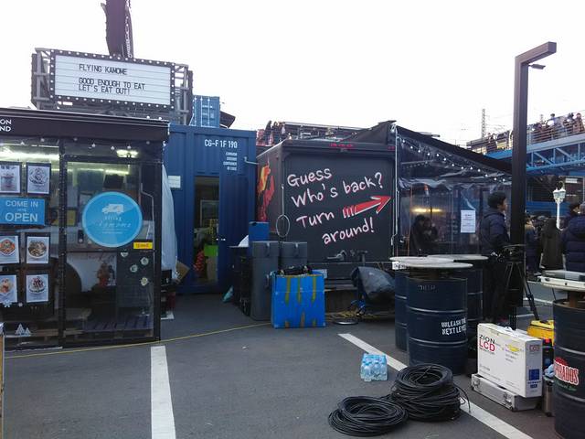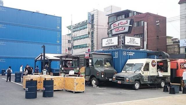 当然,要先看看集装箱的心脏地带再一层层逛。集装箱的中心是几辆卡车围成的小矩形。卡车全是卖小吃的,结合了韩国小型卡车卖小吃和集装箱的特点,打造了小型方便又不乏时尚的小吃摊点。