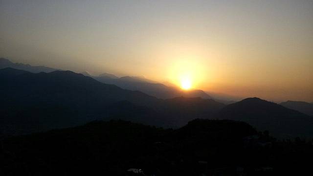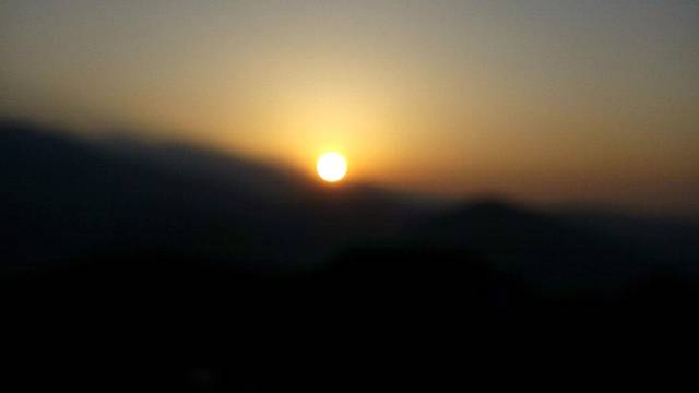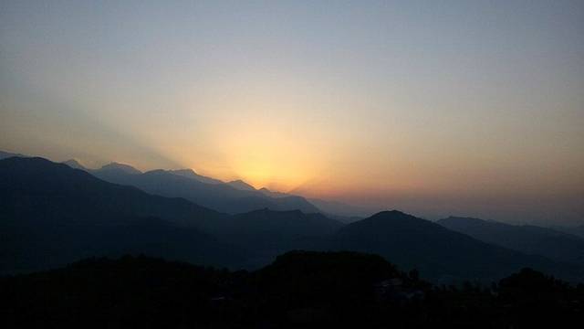 薄薄的晨雾中罩着黛色的群山,太阳慢慢的升起,安纳普尔纳群山沐浴在晨光中。