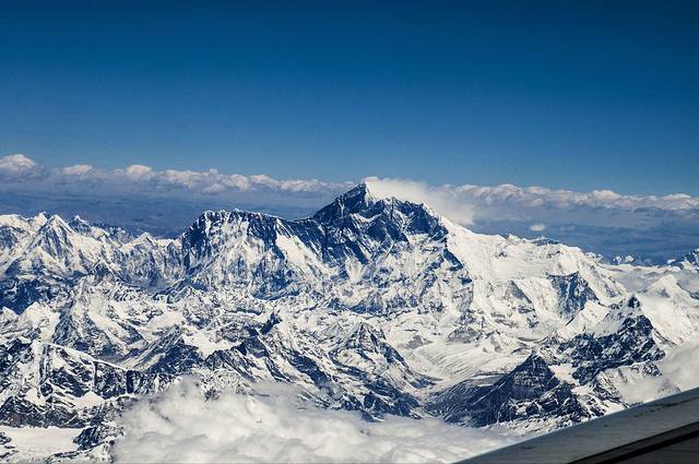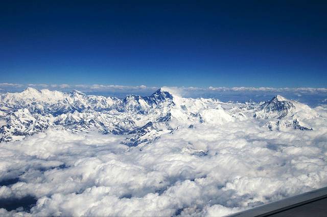在万米高空,飞机象漂浮在阳光下的一只大鸟,白云在机翼下流过,山川河流如巨大的沙盘。就连世界最高的珠穆朗玛也在机翼下壮观的展现在我们的眼前。