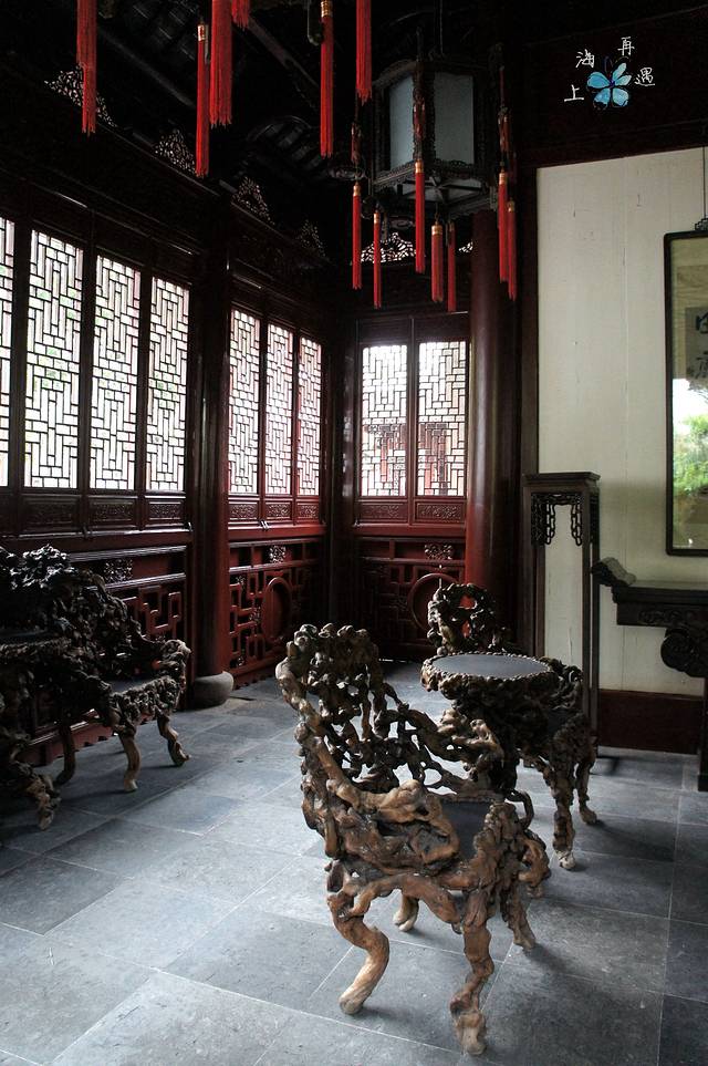 豫园很多有趣的故事,如这个客厅,摆放的是树根做的椅子,传说是主人招待不喜欢却又不得不招待的客人时,就会请他到这个厅,坐得并不平坦舒服的椅子,客人很快就不舒服就会走的,而且根雕也不会失礼主人的身份。