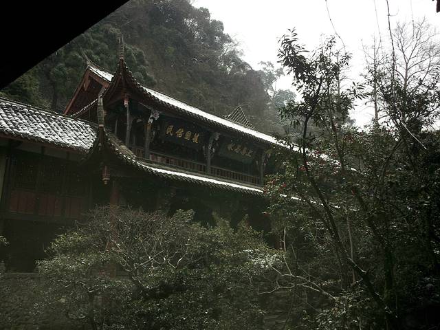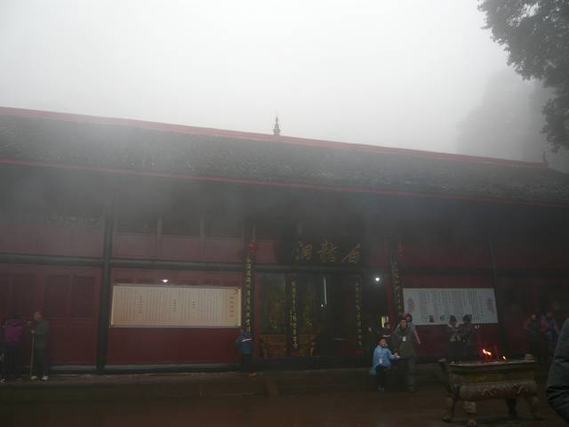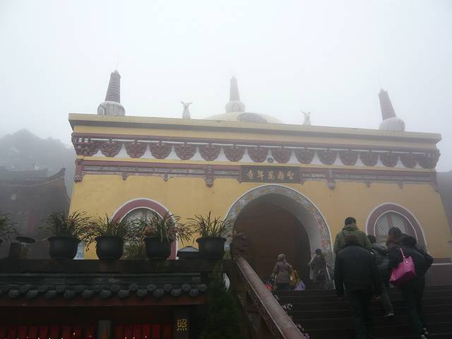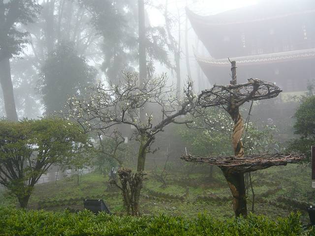 从金顶坐缆车下来后返回雷洞坪停车场再乘车到万年寺停车场,路上在山民开的小饭馆很随意的解决了午餐,依旧十分难吃,然后乘缆车到万年寺。万年寺香火十分旺盛,风景也很好,很多人都去开光祈福,我只是看了看里面的建筑和风景,梅花开放,环境清幽。不过又开始下雨了,一切都朦朦胧胧的,也算别有一番意境。