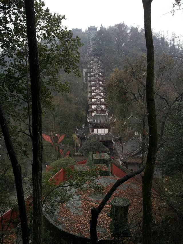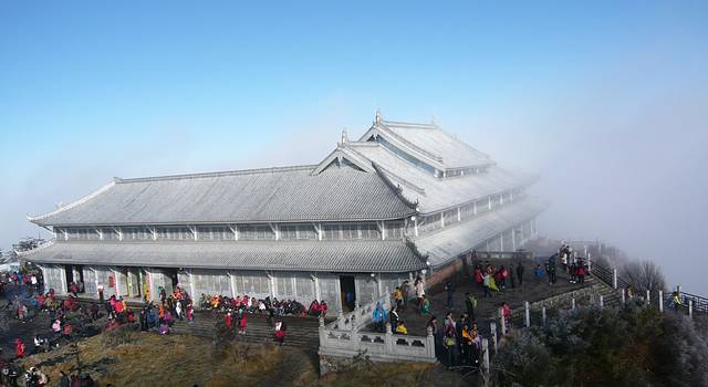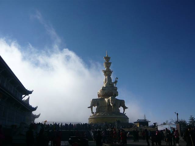 大巴下车的位置是雷洞坪停车场,旁边是缆车的购票处,同样很多人排队,跟团则由导游拿票,需补交200元/人的三次缆车钱。乘坐缆车还需要走一段山路到接引殿,约个小时,因为海拔升高的原因,山上下的都是小雪,路面上薄薄的一层,很滑,一定要穿防滑的鞋。有2条路可选,一条盘山路,一条台阶,可自由选择,然后在乘坐缆车处集合,乘坐缆车去往金顶,缆车上风光不错,可以看见很多茶园,下缆车后仍需要步行一段才可到达金顶,上山的一路都雾气朦朦,不见阳光,可是到达金顶的时候居然出太阳了,非常幸运。之后有一段时间的自由活动。金顶山有大雄宝殿、云殿、舍身崖和十方普贤像,绝对金碧辉煌,风景非常好。