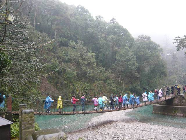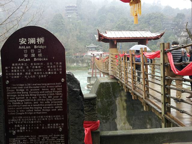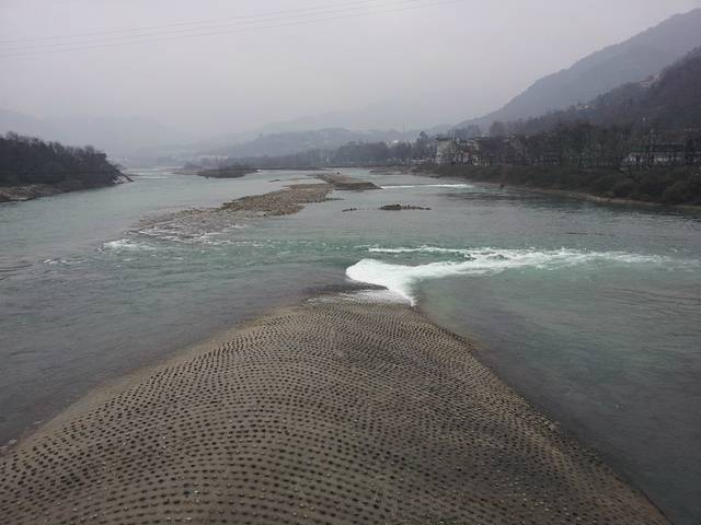 然后乘坐大巴到都江堰景区。下车后换乘景区内观光车先参观南桥,再从离堆公园进入都江堰风景区,游览灾后的离堆公园观碑亭、离堆、堰功道,然后是宝瓶口引水口、飞沙堰泄洪坝、观鱼嘴分水堤。最后过安澜索桥乘玉垒阁步云廊长梯参观纪念李冰父子的二王庙。是全世界迄今为止,年代最久、唯一留存、仍在一直使用,以无坝引水为特征的宏大水利工程,导游会讲解工程的原理,觉得古代人民的智慧真的非常了不起,让人震撼。