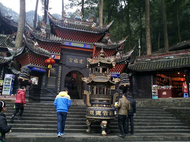下午游览天下幽的青城山,到达停车场后换乘景区观光车到大门口,跟团的话只给2个小时的自由活动时间,没有导游讲解,时间不够,不能达到山顶,而且据说青城后山的风景更好,遗憾这次去不成了。青城山确实非常幽静,是道教名山。山门处有建福宫,因为体力关系,我们只走到天师洞。