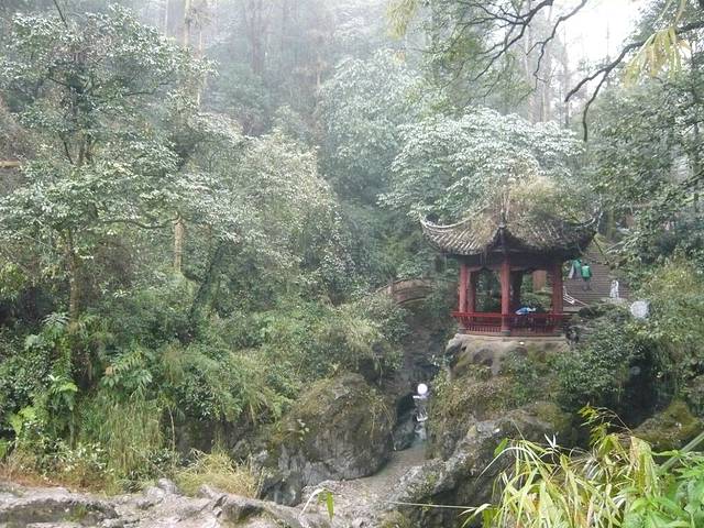 再往下走不久就到了清音阁,也是简单的逛了一下,途中有条去往观猴区的路,导游说挺远的,而且天气不好不一定能看到,大家都选择不去了。从清音阁往五显岗停车场走的这一段基本都是平缓的路,山水风景很好,幸运的是途中还看到了峨眉山的猴子,完全不怕人,而且会抢塑料袋。