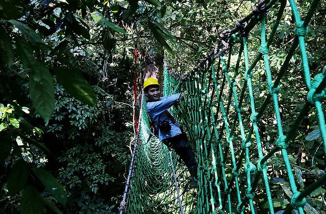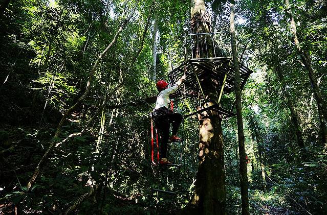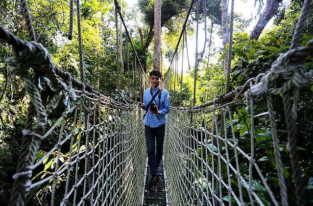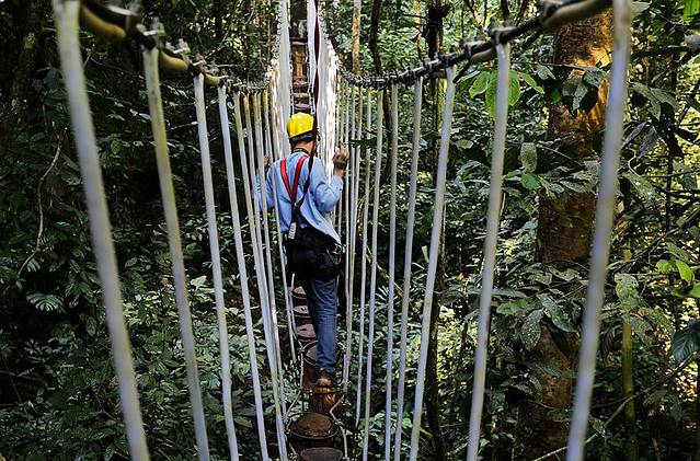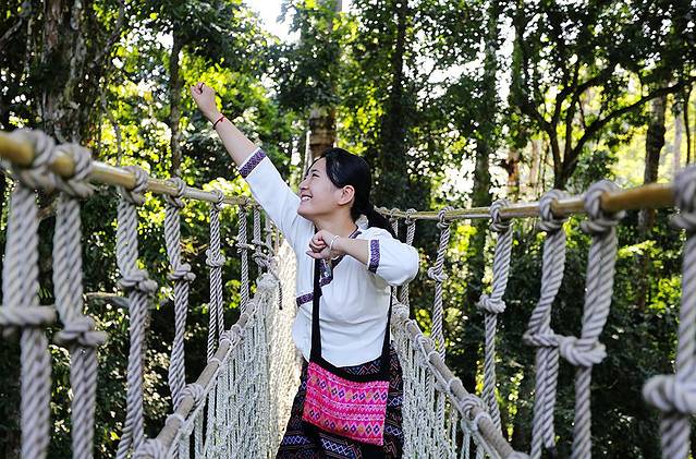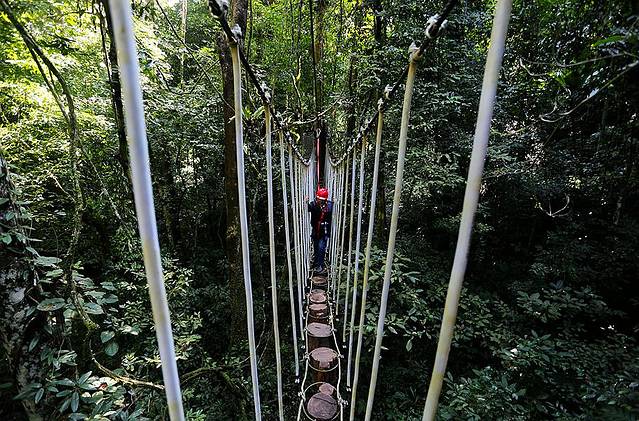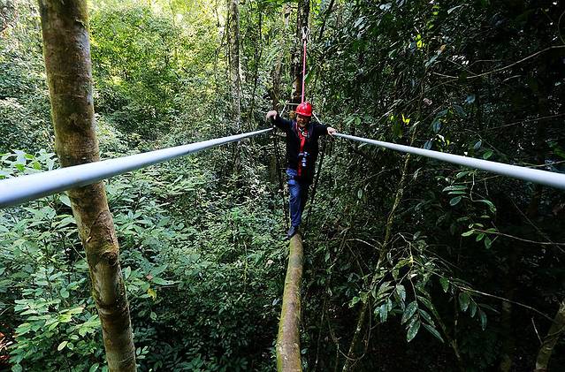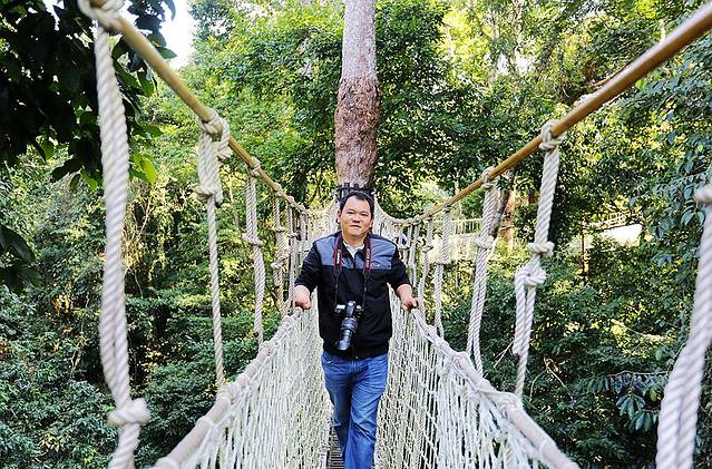 树冠走廊离地有几十米的距离,而且宽度只容单人通过,我有个在西双版纳呆了好多年的朋友一直都不敢走。但对于我们此次同行的几个小伙伴来说,那都不是事儿。走上廊道,玩儿得各种嗨皮,一点儿没觉得有啥好怕的。
