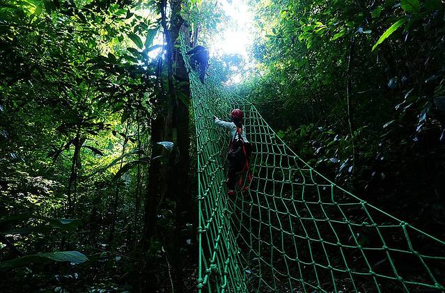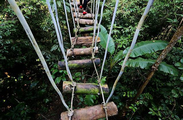 雨林拓展游道是在热带雨林中开发出来的一个素质拓展游道,这个游道的悬空高度不高,在10米以下,但这个游道的保护措施少了,难度增加了,可玩儿性也增加了,亲测,绝对算是体力活儿。要想体验拓展游道,必须要全副武装,因为进入游道需要滑索滑过去,同时后面的每一个项目都需要保险措施。