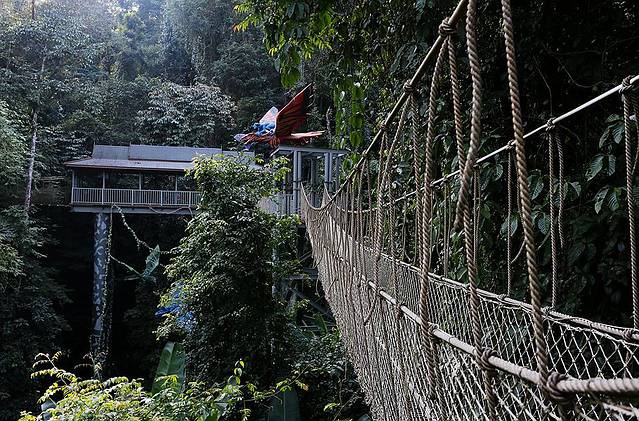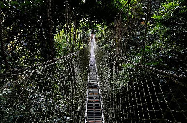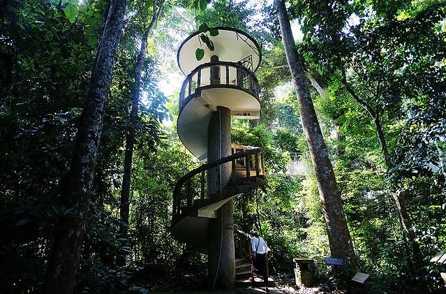 听说这里面有蛇,不过我们没有遇见,而且神奇的是,密林里也没有蚊子。想起上次在云南沧源穿越原始丛林的时候,一路被蚊子给咬得,连眼皮都肿了。走着走着,一个螺旋状的楼梯出现在眼前,非常的震撼,从这个旋梯走上树冠走廊,接下来就是刺激的热带雨林空中之旅了。