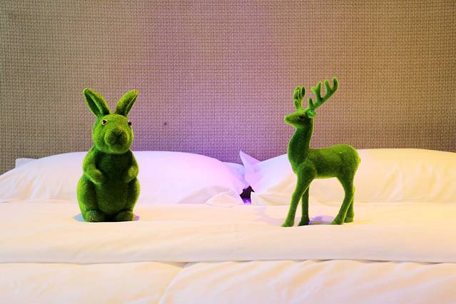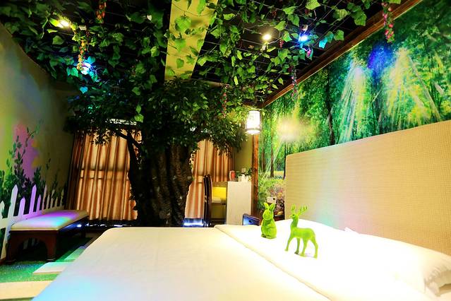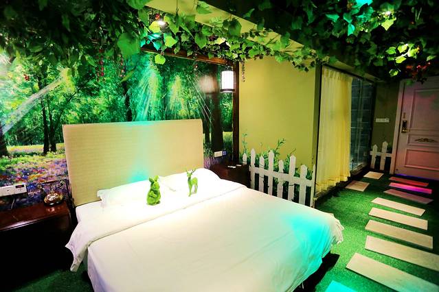 出了西双版纳的机场,明亮的阳光照耀着充满热带风情的棕榈树,一眼就喜欢上了这里。房间事先定好,酒店老板亲自开车在机场外面等候,一路聊着很快就到了酒店,阳光真的很灿烂。这个西双版纳首家以热带雨林风情为主题的情侣酒店,位于西双十二城2栋22层,就在泼水广场和湄公河夜市的中间,去哪里都很方便。我所预订的这个叫“阿莲雅”的森林主题房间,更是非常赞,直接上图: