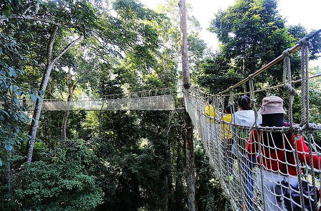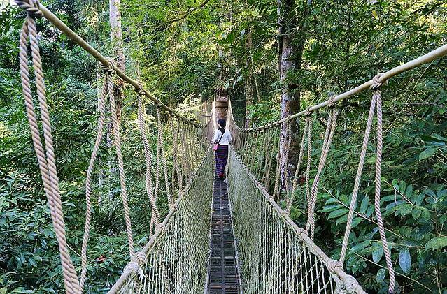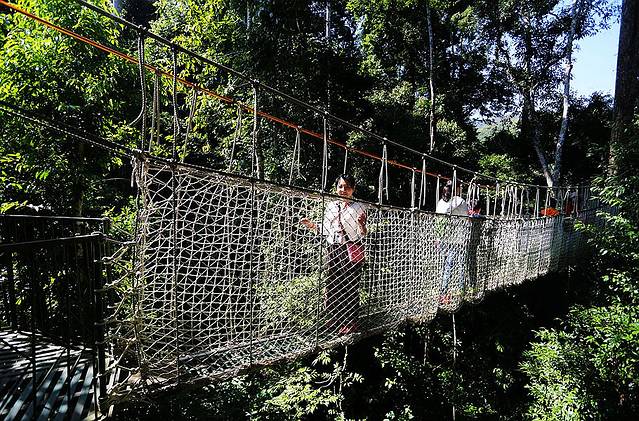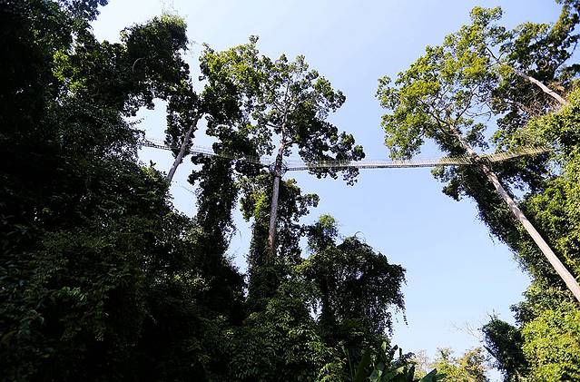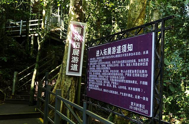 树冠走廊架设在望天树靠近树冠的上半部分,垂直高度达到几十米,我可是亲眼见到小朋友在上面被吓哭的!