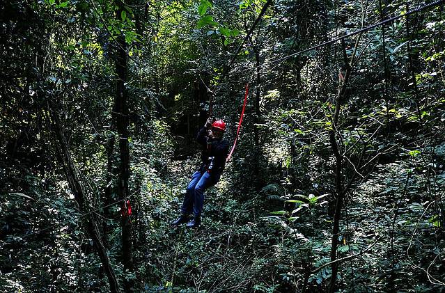 第一项,就是通过滑索正式进入游道。我是第一个滑索过去的,感觉嗖的一下就到达对面了。到达对岸的我给小伙伴们拍照,背景是一片原始密林,有没有感觉很刺激?