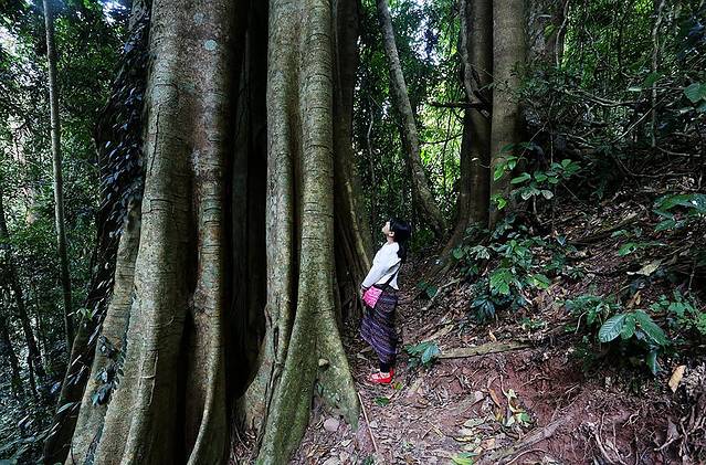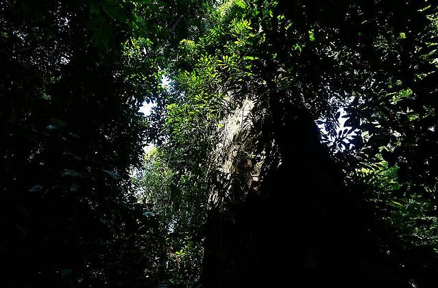 从雨林拓展廊道下来之后,便沿着依稀有人走过的道路痕迹往前走,此时身处原始丛林当中,阳光基本是无法透进来,所以让人无法按照经验来判断大致的时刻。在丛林边走着走着,遇到了一棵超大的树,这种树不是望天树,但枝干粗的可以,而且一眼望不到顶,这样的大树,自然而然的让人生出一种敬畏之心。