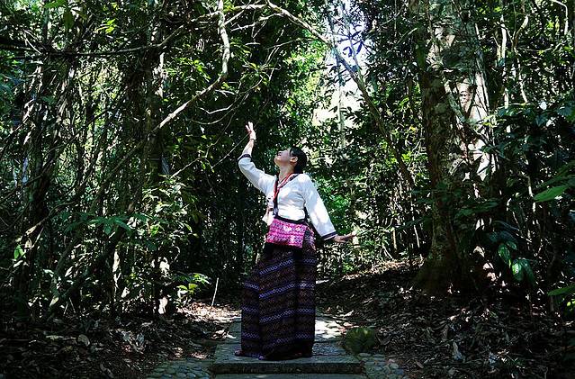 从旁边的小道上山,进入密林,我们的小导游pose摆得挺不错,服装也是充满了 异域风情。密林中就比较凉快了,因为只有星星点点的阳光能够洒落地面。