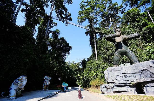 在望天树景区,生长着一棵棵40-70米高的望天树,架设在望天树上的“空中走廊”,全长2.5公里,它把公路两旁的原始森林连接起来,可在广阔的视野上尽情地领略热带雨林的奇异风光。走近公路,会首先看到一只固定不动的大猩猩,造型嘛,有点儿丑,号称是雨林守护者。但当你出现在它的视野里,这个猩猩就会发出有力的吼声,同时用双手拍打胸膛,咋看之下把有点儿吓人,仔细看吧,这货还挺可爱。仔细看图,有没有发现架设在望天树上的树冠走廊?